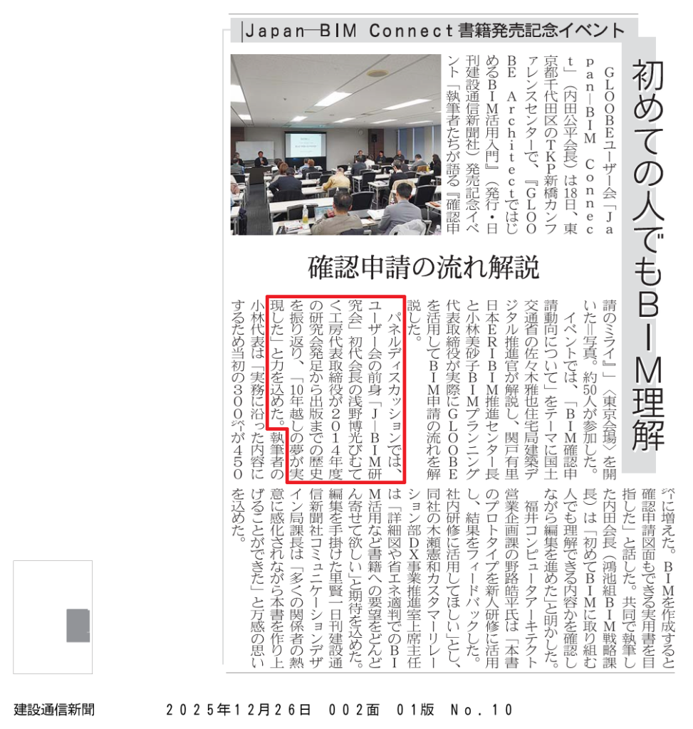 建設通信新聞に弊社代表取締役が登壇したイベントの記事が掲載されました 未分類 2026.01.27 2025年12月26日の建設通信新聞に、弊社代表取締役 浅野博光が登壇した『GLOOBE ArchitectではじめるBIM活用入門』発売記念イベントの記事が掲載されました。